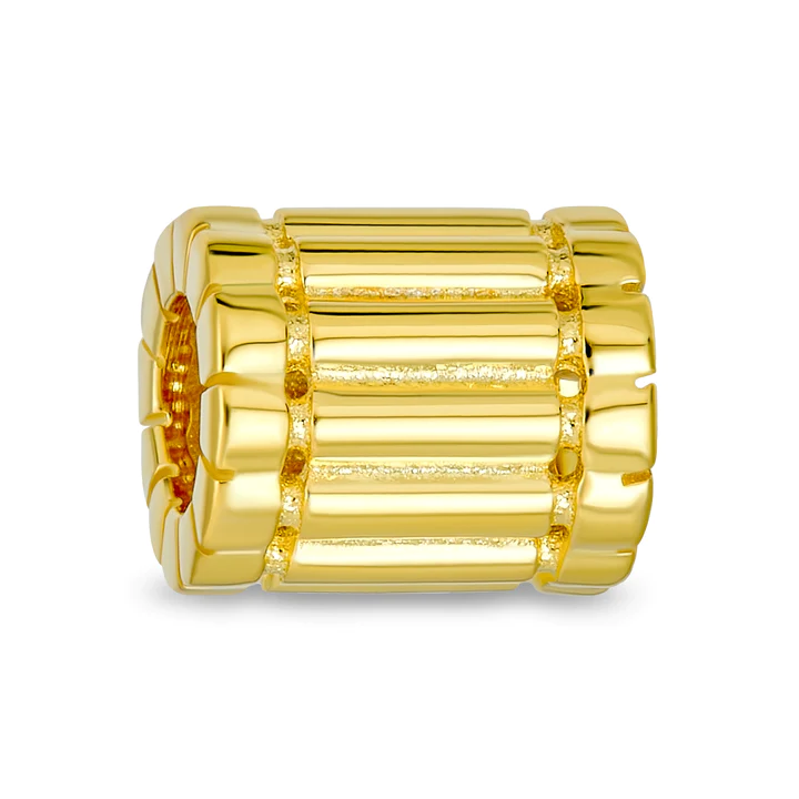 With grooves and beaded edges this gold plated, sterling silver 3D charm is sure to add style while spacing out your bead story with its 4.5mm unthreaded core.